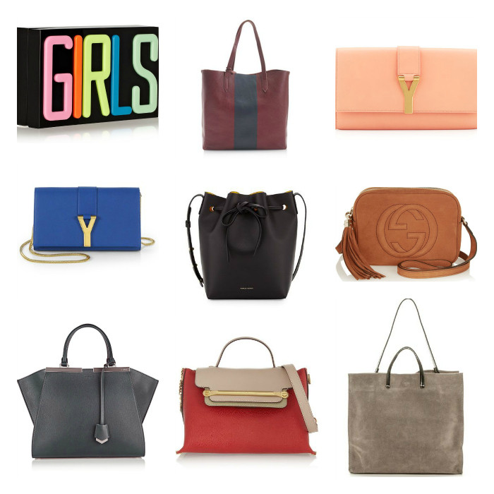 Every fall, I get the urge to paint my nails fun fall colors, get cozy in sweaters (or ponchos for this year) and I also have a bit of a problem where I have to have a fall bag. Regardless of whether or not I have a wonderful bag from the year before, there is something about fall that makes me want something new and fresh. Blame it on new beginnings with the school year and trees shedding their leaves -all I know is that my bank account takes a big hit right around October. What's that you say? It's October 1st? Yeah, I know.... This year's addition is going to be a tough decision. The pink Chloe bag below is called the Clare bag and if that's not a sign that I need it I don't know what is! I think I may actually end up going with the Mansur Gavriel bucket bag that has been selling out everywhere orrrr the Saint Laurent chain clutch in blue. I've had my eye on that one for a while. The gray goyard tote with my monogram (not pictured below) woulddd be a perfect school bag. Decisions decisions.